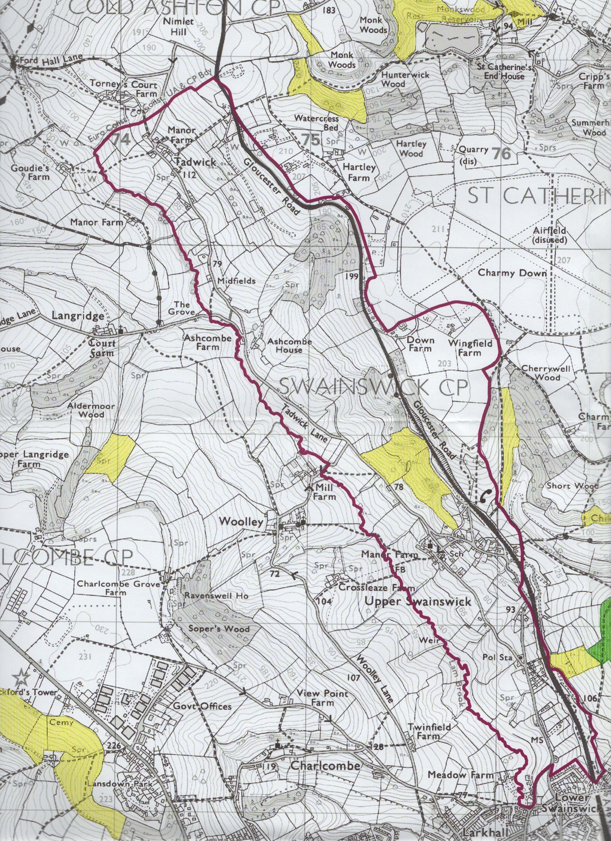 Hill it borders the Woolley Valley in the west and runs North to the Gloucestershire border. Though large in area, the Parish has fewer than 270 residents, who live mainly in the villages of Swainswick and Tadwick. The Parish lies adjacent to the Parish of Charlcombe and is close to the Cotswolds Area of Outstanding Natural Beauty (AONB). Administratively, Swainswick forms part of the Bathavon North Ward of Bath & North East Somerset (B&NES).