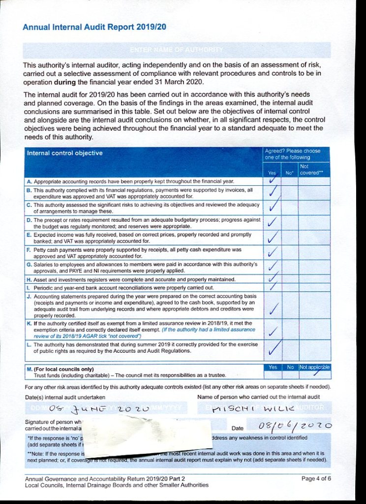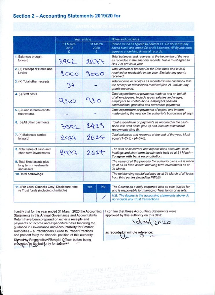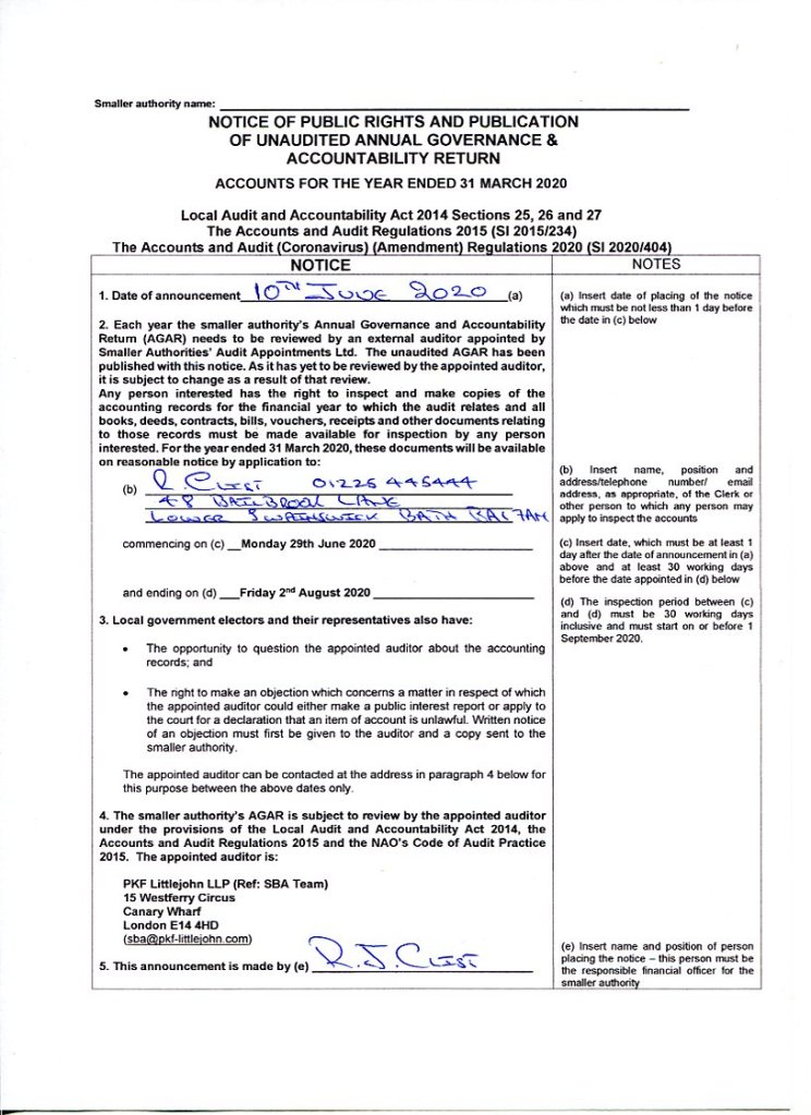 The Parish Council met on the 15th June 2020 and the audit process has been approved and is now complete. The relevant authorised documentation can be found below.
