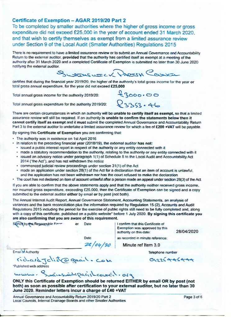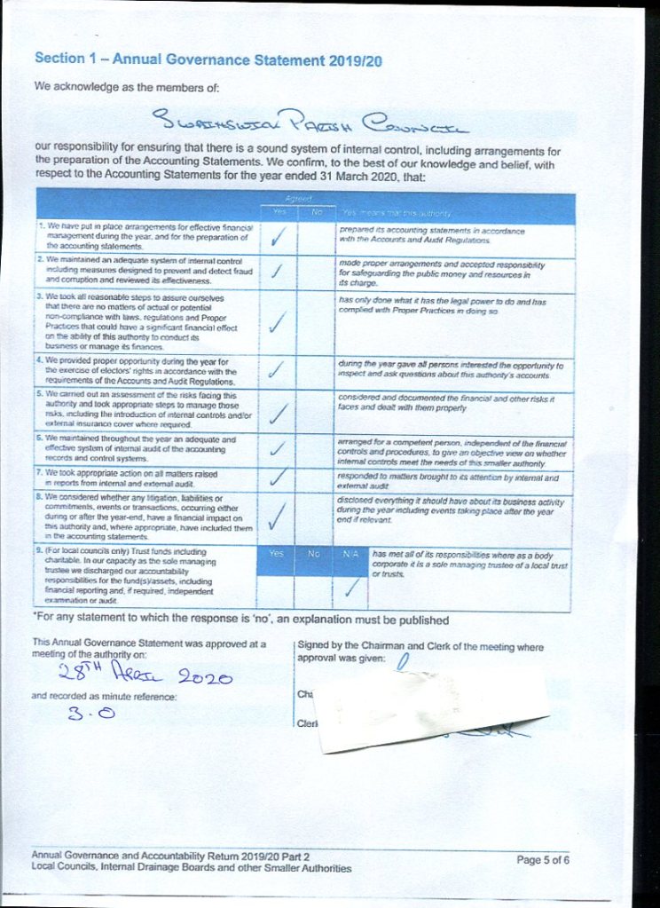 The following documents were approved at the Parish Council meeting held on 15th June 2020 and, in conjunction with those above, conclude the required Audit procedure.